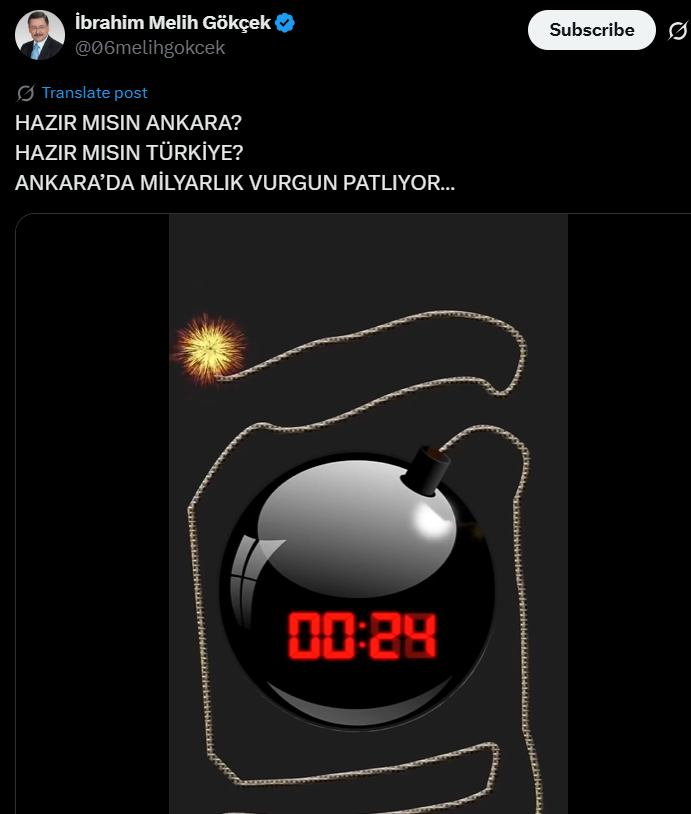 Eski Ankara Büyükşehir Belediye Başkanı Melih Gökçek’in gece saat 12.35’te ve operasyondan 8 saat önce, “Ankara’da milyarlık vurgun patlıyor” paylaşımı yaptığı görüldü.
