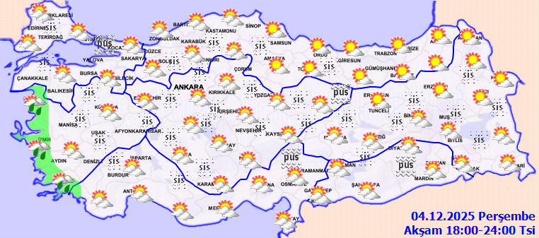 Parçalı ve çok bulutlu, Kıyı Ege ile Manisa ve Denizli çevrelerinin yerel olmak üzere sağanak ve gök gürültülü sağanak yağışlı geçeceği tahmin ediliyor. Yağışların, İzmir, Aydın ve Muğla’nın kıyı kesimlerinde yer yer kuvvetli olması bekleniyor. Bu sabah ve gece saatlerinde iç kesimlerinde pus ve yer yer sis görüleceği tahmin ediliyor.